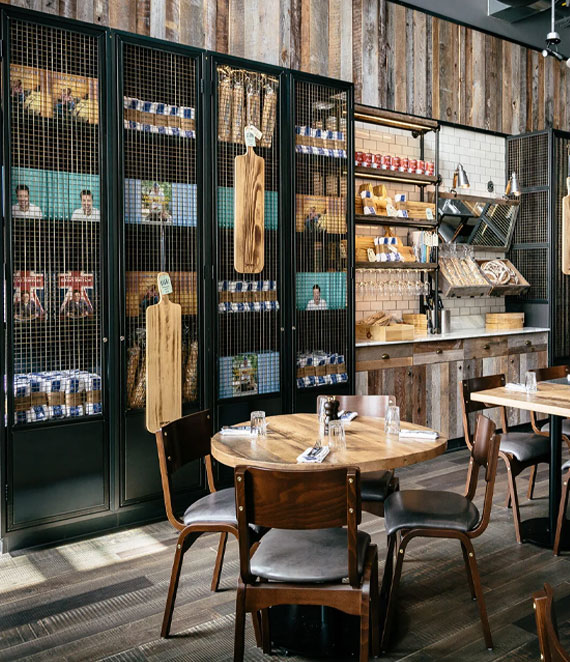 With a lounge that opens onto the mall corridor and a seating area and seasonal patio that opens outdoors, the restaurant receives a large amount of natural lighting. The indoor restaurant seats 212 people and offers varying experiences at the lounge, bar, dining, and antipasti sections.